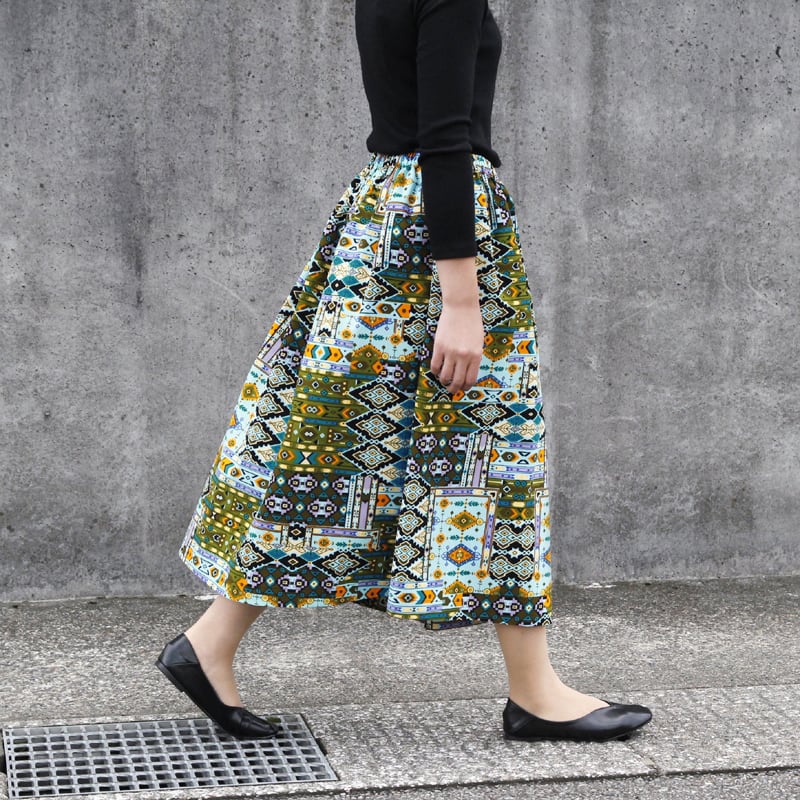 鮮やかな色彩とシルエットで魅せる、存在感のあるアフリカ布のスカート。コーディネートの主役となって、ロングシーズン活躍してくれるアイテムです。