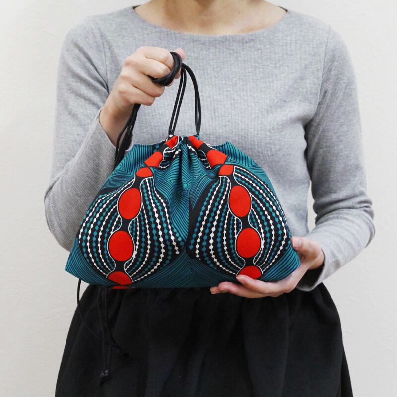 アフリカ布の巾着ショルダー( ピーコックブルー )斜めがけ たすき掛け インナーバッグ