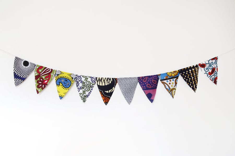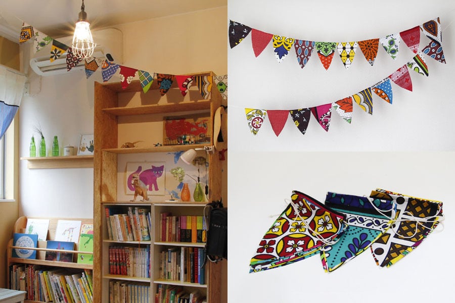 他の布で作ったガーランドと比べると、アフリカ布の鮮やかさが際立ちます。室内でも野外でも、楽しくオシャレな気分を演出してお楽しみください。