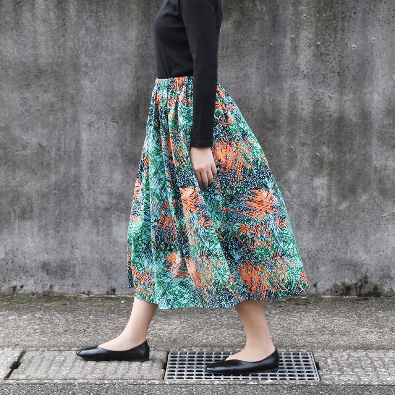 生地の分量をたっぷりとったボリューム感のある一枚で、年齢や体型を選ばないスカートに仕上げています。