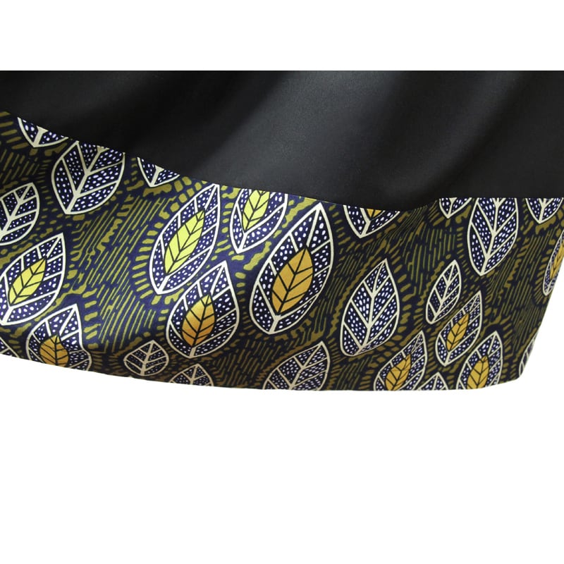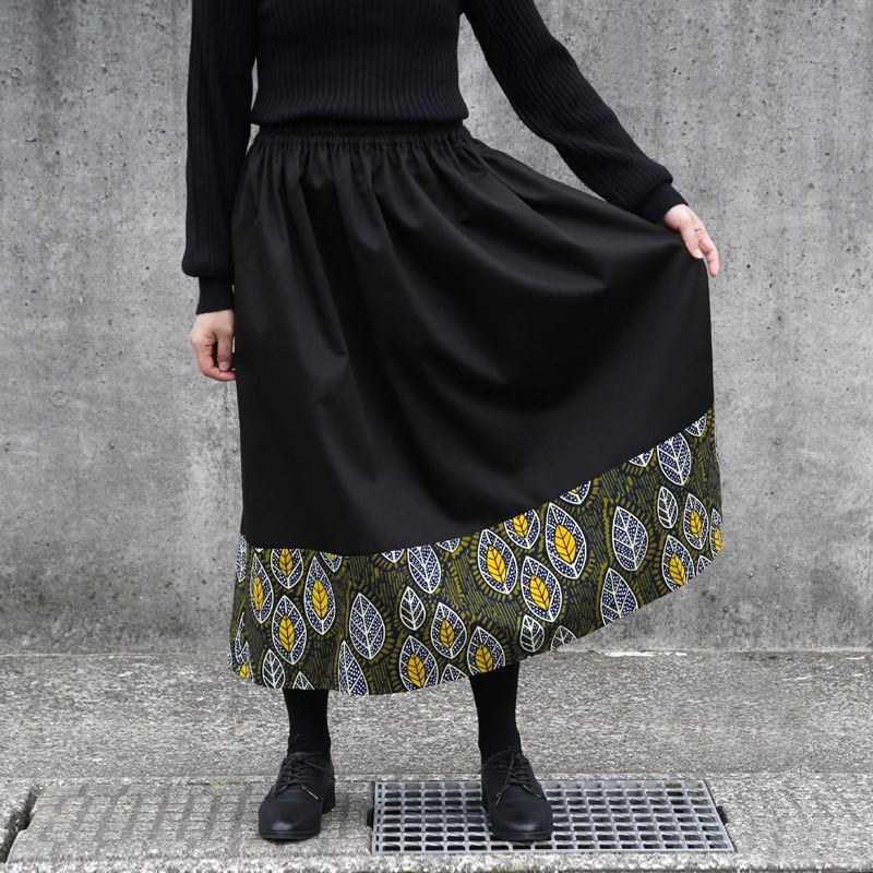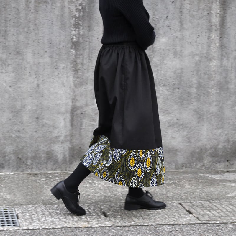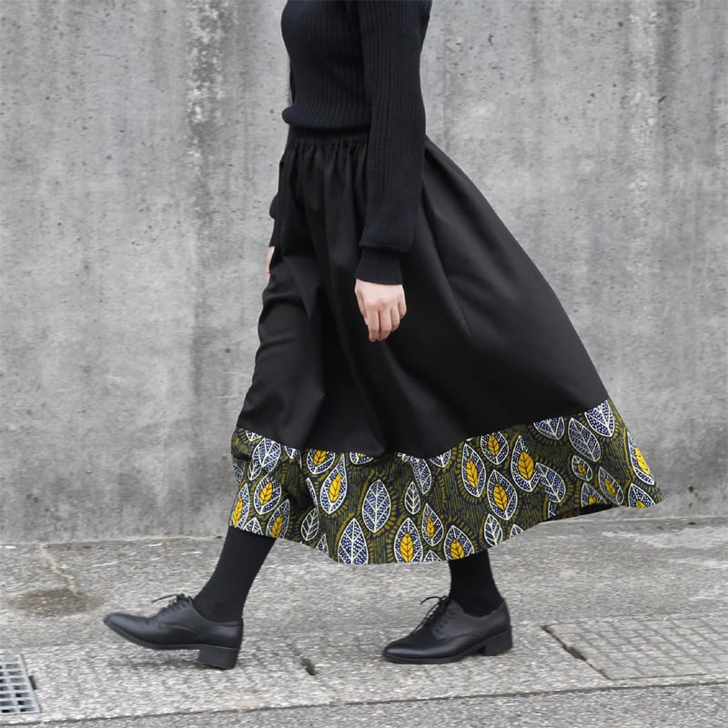 上品でベーシックな黒のチノクロスとアフリカ布を合わせたことにより、独特の存在感のあるスカートに仕上がっています。
