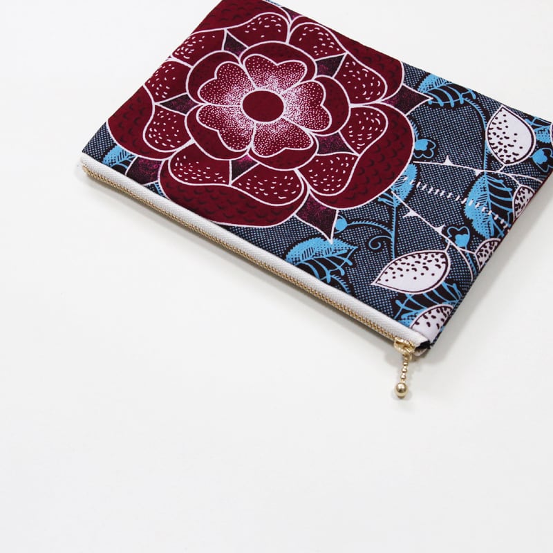 アフリカ布のフラットポーチ ( ローズ 薔薇 ) アフリカンプリント 手帳ケース パスポート 薬手帳 通帳入れ