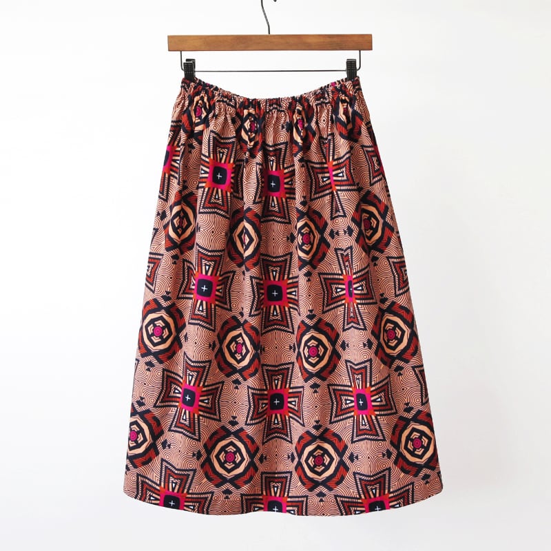 鮮やかな色彩とシルエットで魅せる、存在感のあるアフリカ布のスカート。コーディネートの主役となって、ロングシーズン活躍してくれるアイテムです。