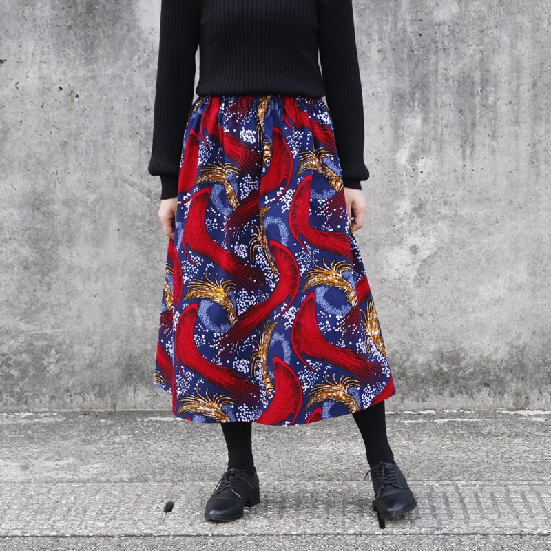 鮮やかな色彩とシルエットで魅せる、存在感のあるアフリカ布のスカート。コーディネートの主役となって、ロングシーズン活躍してくれるアイテムです。