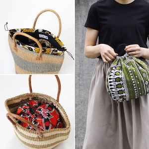 鮮やかな色彩のアフリカ布、ナチュラルなカゴバッグとの相性は抜群です。