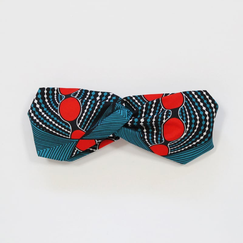 アフリカ布を頭に巻くイメージをターバンに仕立ててみました。鮮やかな色柄がよく映えるようにバンド幅を大きく取っています。