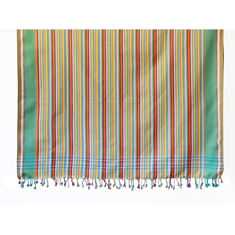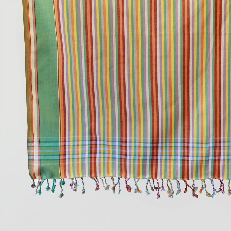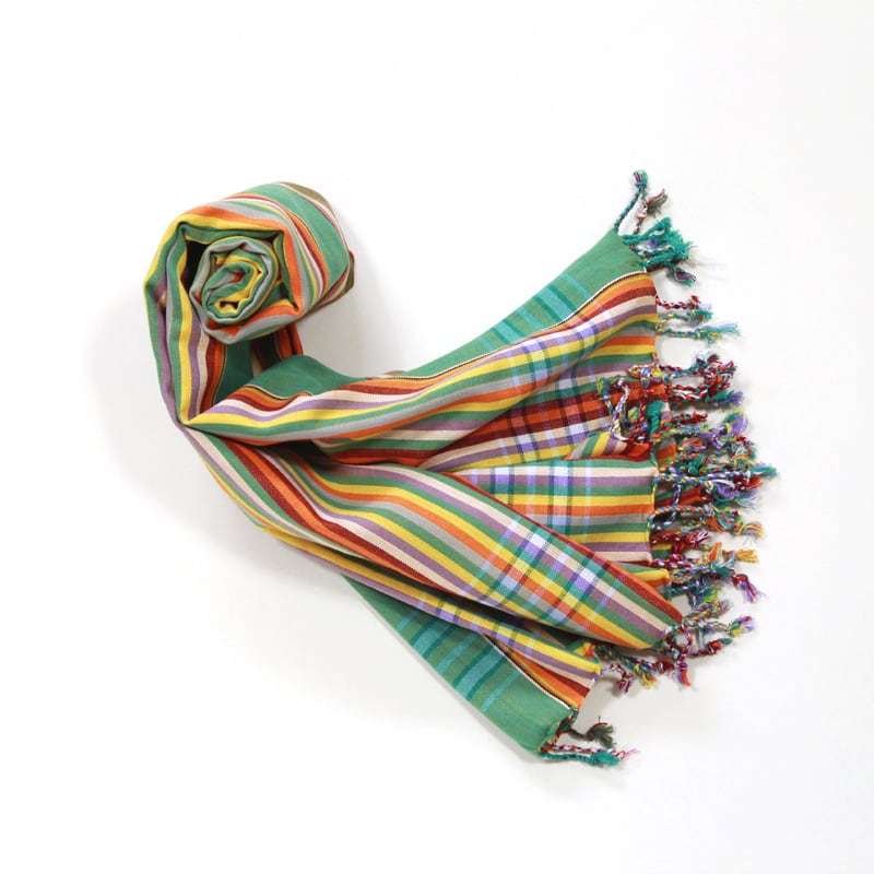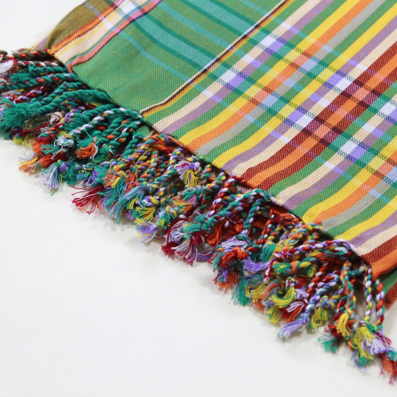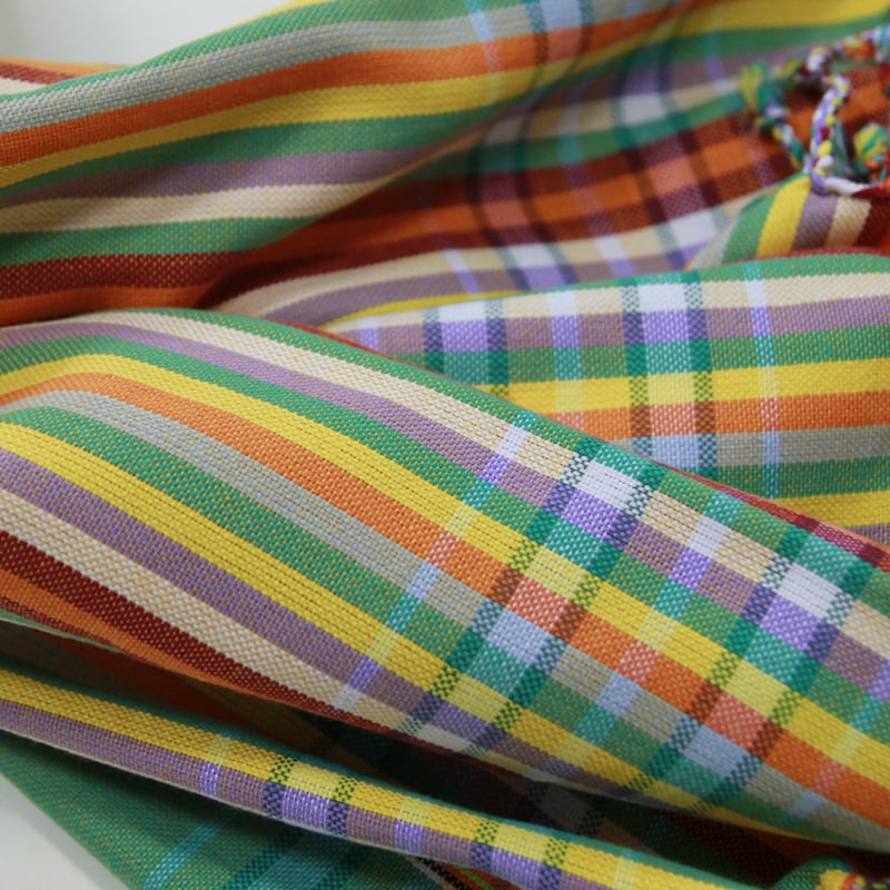 鮮やかな色合わせや単調ではないストライプ。アフリカらしいカラフルな色合わせなのに、決して派手ではなく、不思議と落ち着いた感じのする独特の美しさがキコイの魅力です。端はフリンジ処理が施され、可愛らしい雰囲気に。