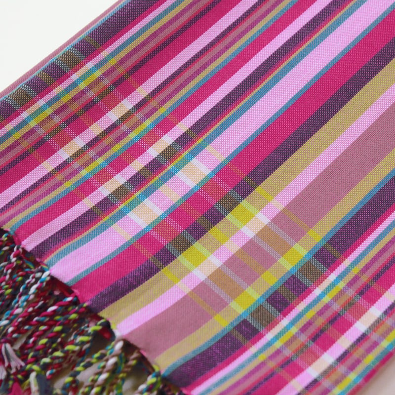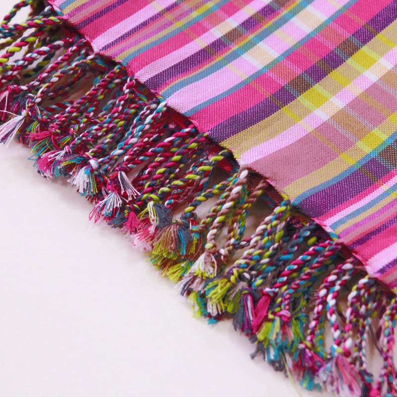 鮮やかな色合わせや単調ではないストライプ。アフリカらしいカラフルな色合わせなのに、決して派手ではなく、不思議と落ち着いた感じのする独特の美しさがキコイの魅力です。端はフリンジ処理が施され、可愛らしい雰囲気に。