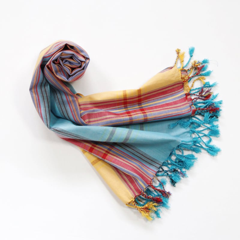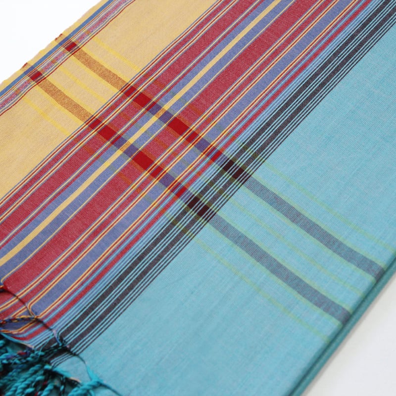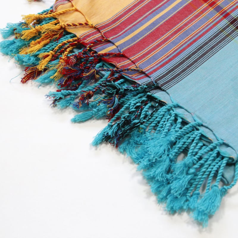 鮮やかな色合わせや単調ではないストライプ。アフリカらしいカラフルな色合わせなのに、決して派手ではなく、不思議と落ち着いた感じのする独特の美しさがキコイの魅力です。端はフリンジ処理が施され、可愛らしい雰囲気に。