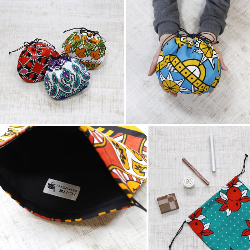 コロンとした形がかわいいアフリカ布の巾着袋。