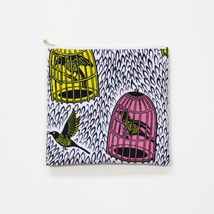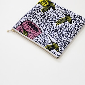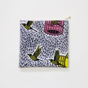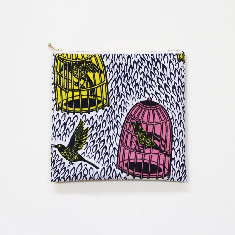 大容量・フラットポーチ(鳥とカゴ)アフリカンプリント 鳥模様 鳥かご