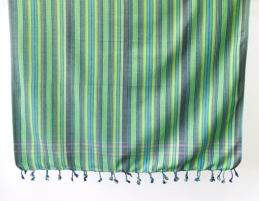 鮮やかな色合わせや単調ではないストライプ。アフリカらしいカラフルな色合わせなのに、決して派手ではなく、不思議と落ち着いた感じのする独特の美しさがキコイの魅力です。端はフリンジ処理が施され、可愛らしい雰囲気に。