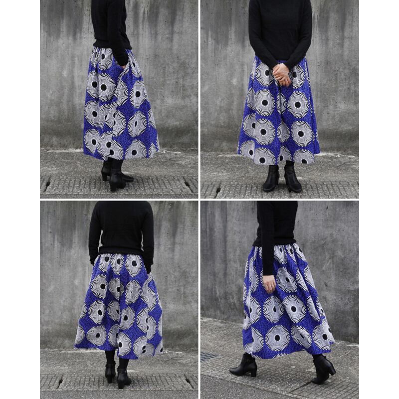 1枚のサイズが決まっているカンガでは作れなかった、理想的な丈の長さやシルエットを追求。「 デザイン・はき易さ・ 使い易さ 」アフリカ布のスカートが、" 使える定番 " になるようにと制作したスカートです。
