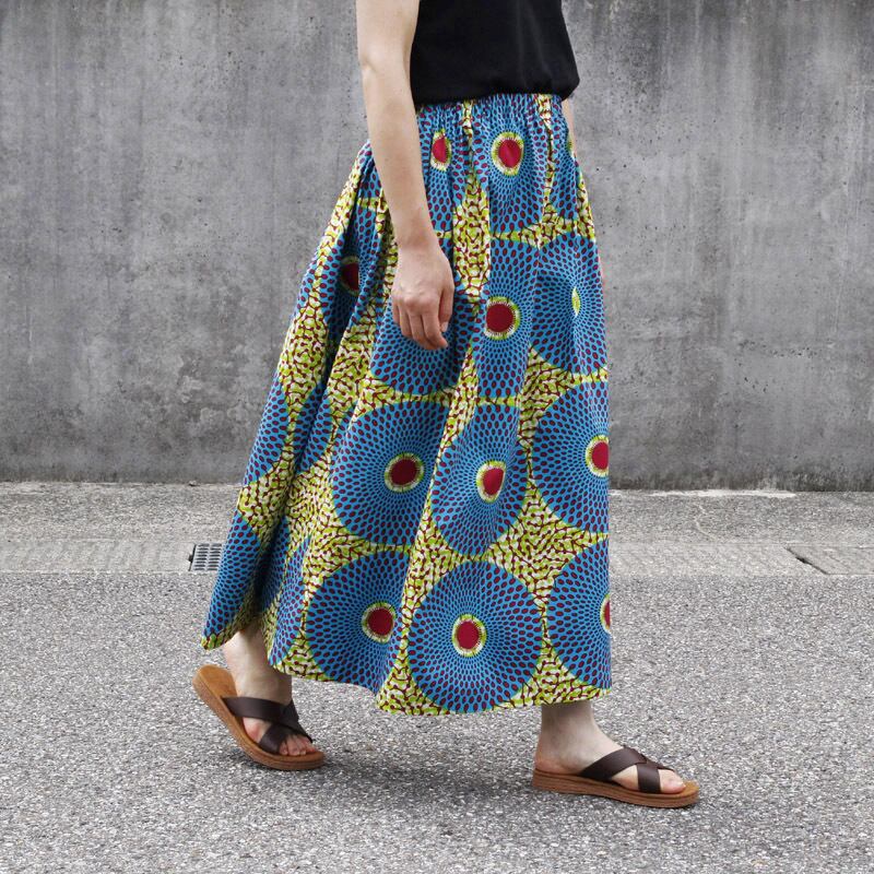 1枚のサイズが決まっているカンガでは作れなかった、理想的な丈の長さやシルエットを追求。「 デザイン・はき易さ・ 使い易さ 」アフリカ布のスカートが、" 使える定番 " になるようにと制作したスカートです。