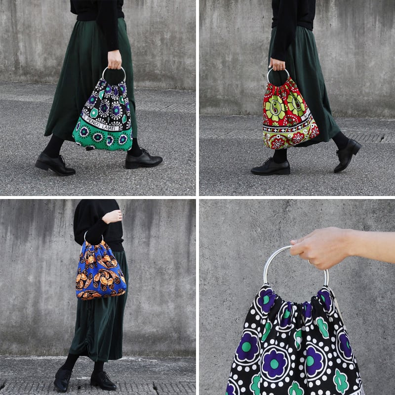 アフリカらしい色合わせなのに不思議と落ち着いた印象を醸し出す、存在感のあるバッグです。金属のリングハンドルとアフリカ布のコントラストが、お洒落で洗練した雰囲気を演出します。リングは持つだけでなく、肘まで腕を通すことができるサイズ感。