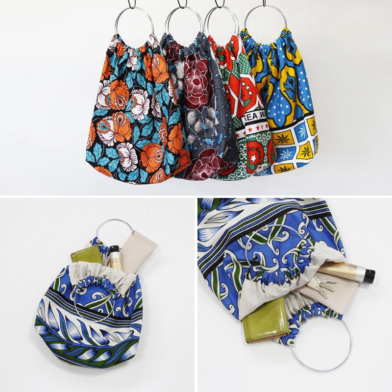 アフリカらしい色合わせなのに不思議と落ち着いた印象を醸し出す、存在感のあるバッグです。金属のリングハンドルとアフリカ布のコントラストが、お洒落で洗練した雰囲気を演出します。リングは持つだけでなく、肘まで腕を通すことができるサイズ感。
