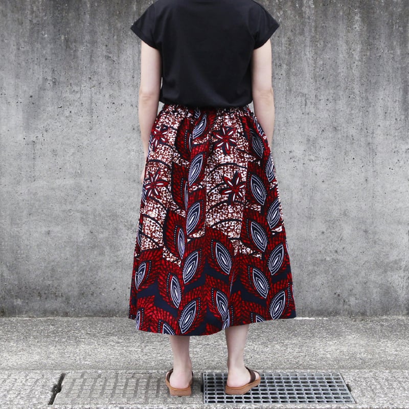 【受注制作】アフリカ布のギャザースカート( レッド リーフ )アフリカンプリント アフリカンファブリック