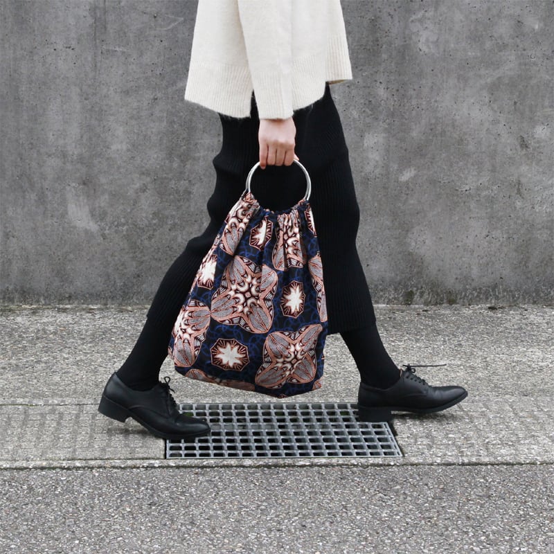 アフリカらしい色合わせなのに不思議と落ち着いた印象を醸し出す、存在感のあるバッグです。金属のリングハンドルとアフリカ布のコントラストが、お洒落で洗練した雰囲気を演出します。リングは持つだけでなく、肘まで腕を通すことができるサイズ感。