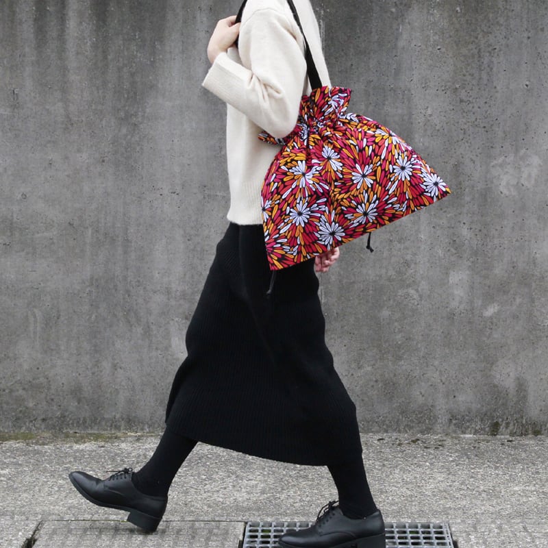 アフリカ布の華やかさと、巾着の可愛らしさをコーディネートにプラスしてくれるアイテムです。