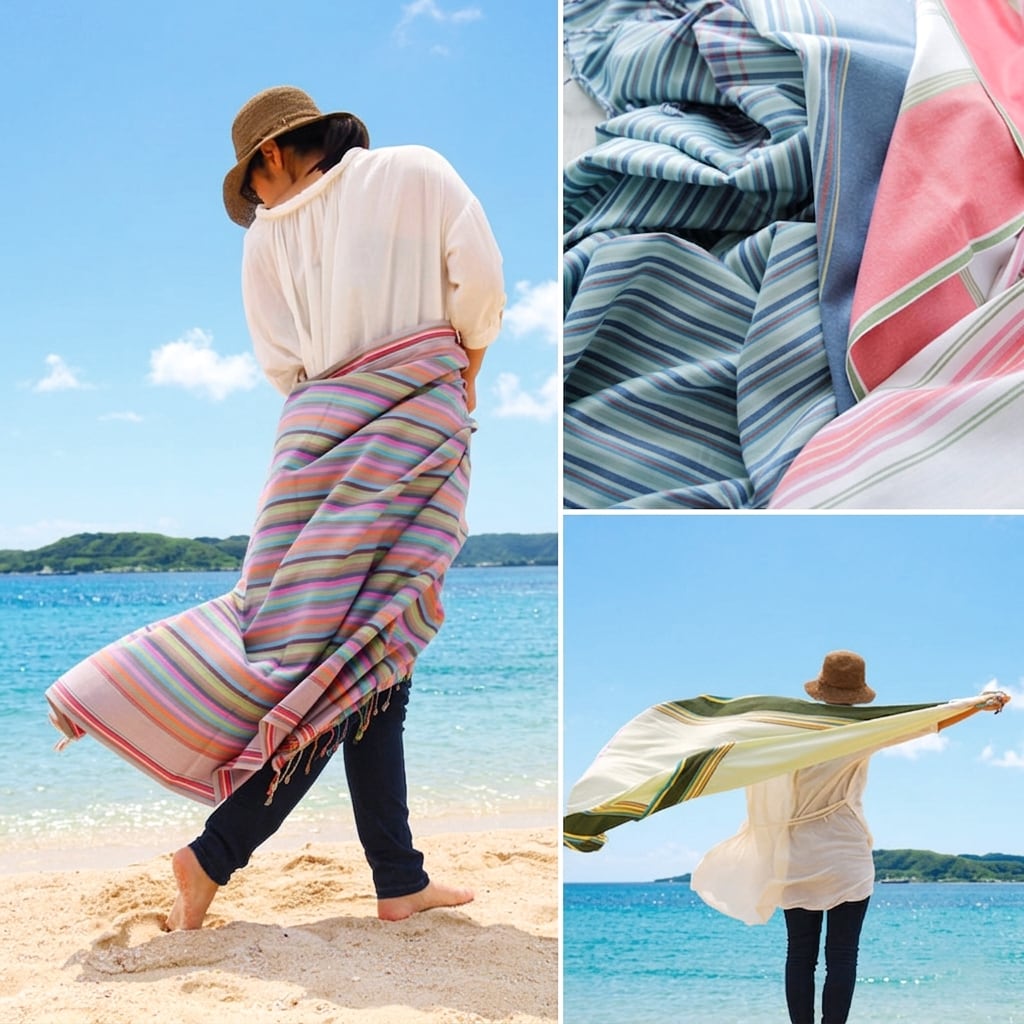 春夏用のショールやストール、ビーチなどの日よけとして、ファッション性だけでなくさまざまなシーンで実用的に活躍してくれます。